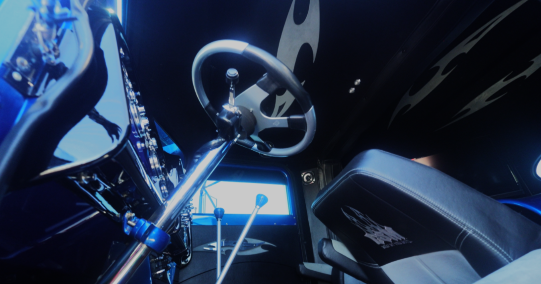 The interior add-ons only add to the overall vibe of the electric blue exterior, with complementary flooring, chrome-polished shifter base trim, and a custom-painted dash.